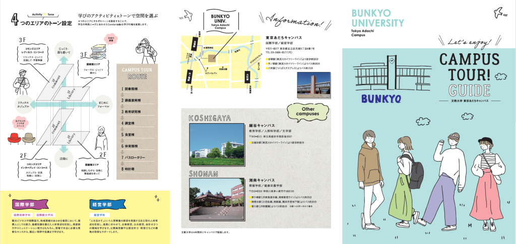 文教大学 あだちキャンパスMAP Services:デザイン、ディレクション Size:A5 6ページ 巻き三つ折り Client:文教大学 様 来校した方が校内を見学するための手持ち資料として作成。イラストを使用しかわいらしい雰囲気に仕上げました。 MORE 2021/04/01 投稿先 その他 ← 過去の投稿へ 次の投稿へ →